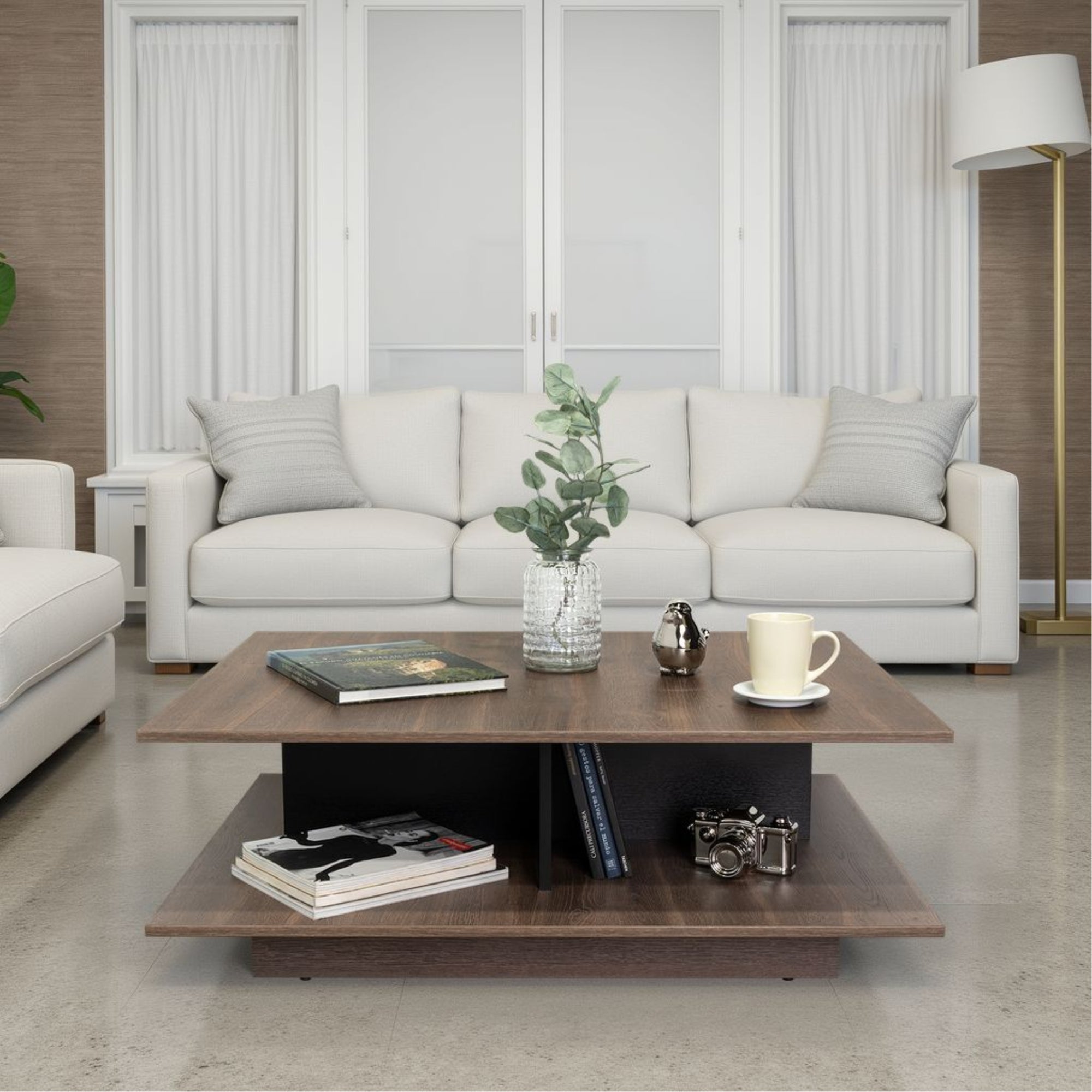 Mesa de centro bengali coñac y wengue, elegante y versátil, perfecta para dar un toque ordenado y funcional a tu sala.