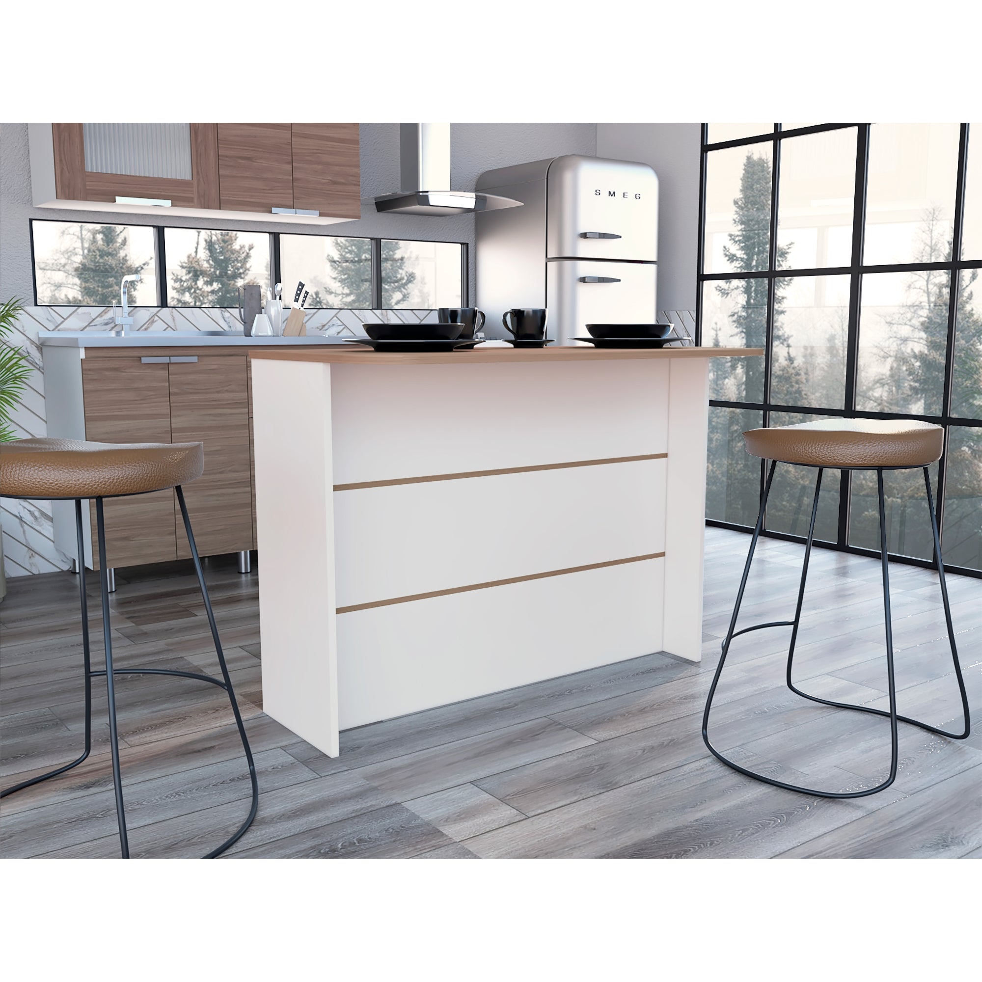 Añade estilo a tu cocina con la isla fendi en blanco y castaño. con una estructura funcional y moderna, es ideal para organizar y embellecer tu espacio.