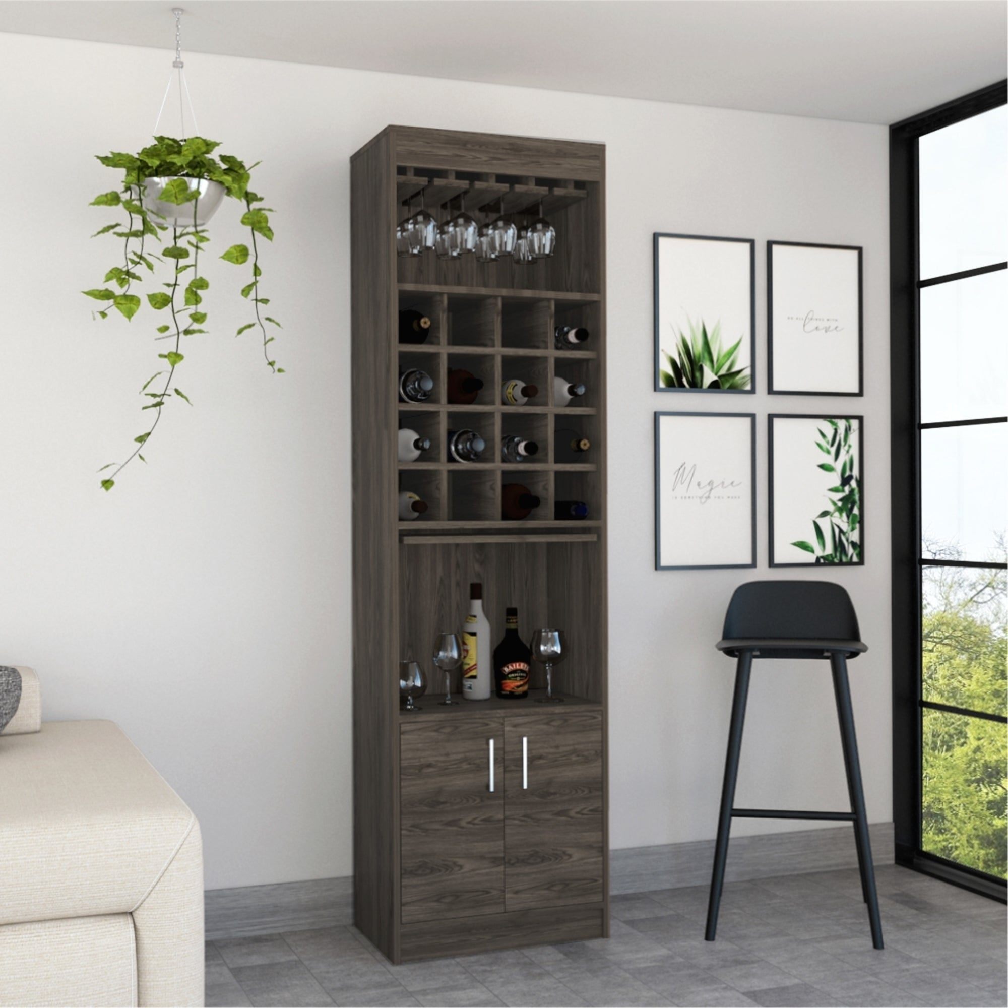 Bar alto kava beijing coñac y blanco con portacopas, elegante y versátil, almacenamiento eficiente para bebidas y copas en tu hogar.