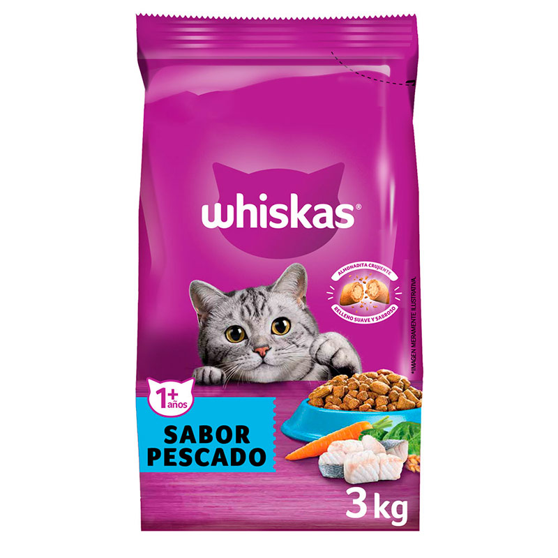 Whiskas® adulto sabor pescado es alimento seco 100% completo y balanceado, desarrollado especialmente para gatos adultos mayores a 1 año. la nueva receta de whiskas alimento seco combina la nutrición que tu gato necesita, con el sabor que ama. desarrollado nutricionalmente con veterinarios para ayudarlo a mantenerse saludable y ronroneando durante toda la vida. y ahora, con prebióticos que ayudan a una buena digestión. ¡prueba también whiskas sobre! ¡a tu gato le encantará! whiskas® es un alimento avalado y recomendado por el centro de investigación waltham, una de las autoridades mundiales líderes en nutrición, cuidado y bienestar animal.