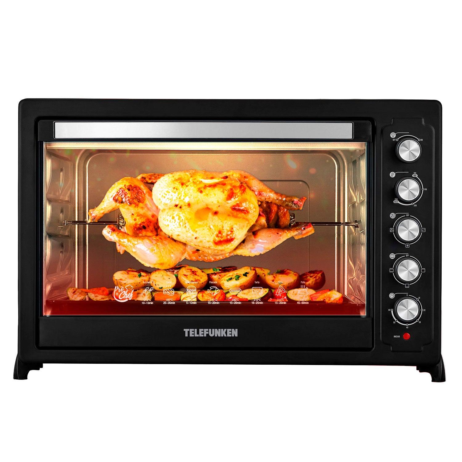 El telefunken tf e1500c es un horno semi industrial de 150 litros de capacidad, ideal para quienes buscan un rendimiento profesional en la cocina. equipado con función de spiedo, modo de convección y un termostato de alta precisión, permite múltiples configuraciones de cocción adaptándose a una amplia variedad de recetas. gracias a su lámpara interior incorporada, podrás monitorear tus preparaciones en tiempo real, mientras que su superficie interna antiadherente facilita una limpieza rápida y profunda.dispone de cinco perillas de control manual para un ajuste preciso de la temperatura (de 100c a 250c) y un temporizador programable de hasta 60 minutos. su diseño robusto incluye una base antideslizante de alta estabilidad y una potencia máxima de 3200w, ideal para un uso intensivo.además, incluye bandeja, rejilla, juego de asador y asa de bandeja, convirtiéndolo en una solución versátil y confiable tanto para cocinas comerciales como para hogares exigentes. **requiere de una instalación electrica de al menos 16 amperes. características: horno semi industrial de 150 litros. función de spiedo. termostato preciso. lampara interna incorporada. múltiples configuraciones de cocción. control manual de cocción. 5 perillas de configuración. rango de temperatura de los 100 a 250c. tiempo programable hasta 60 minutos. modo de convección. superficie interna antiadherente. base anti deslizante y de alta estabilidad. accesorios: bandeja, rejilla, juego de asador y asa de bandeja. medidas producto (altoxanchoxlargo): 48,5x72x55cm. medidas interior (altoxanchoxlargo): 34x55x49cm. medidas bandeja: 52x36,5cm. largo cable: 90cm. potencia máxima de 3200w. alimentación: 220/240v - 50/60.