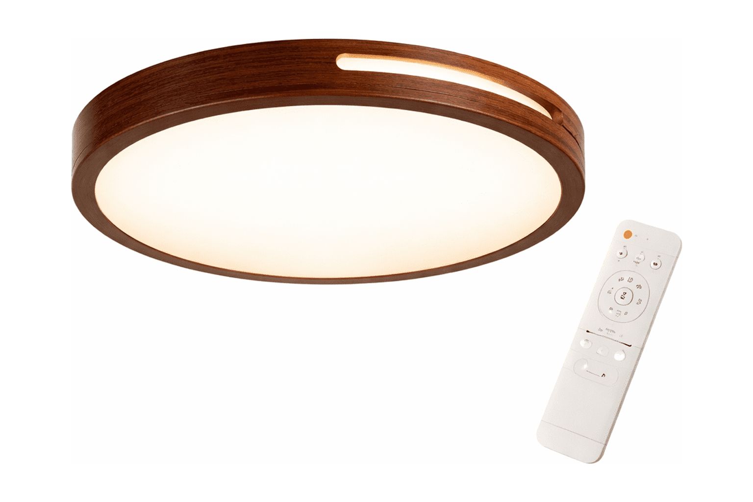 Plafón led redondo 36w, diseño en madera oscura, ideal para crear ambientes cálidos y modernos. incluye control remoto con 3 tonos de luz y regulación de intensidad.