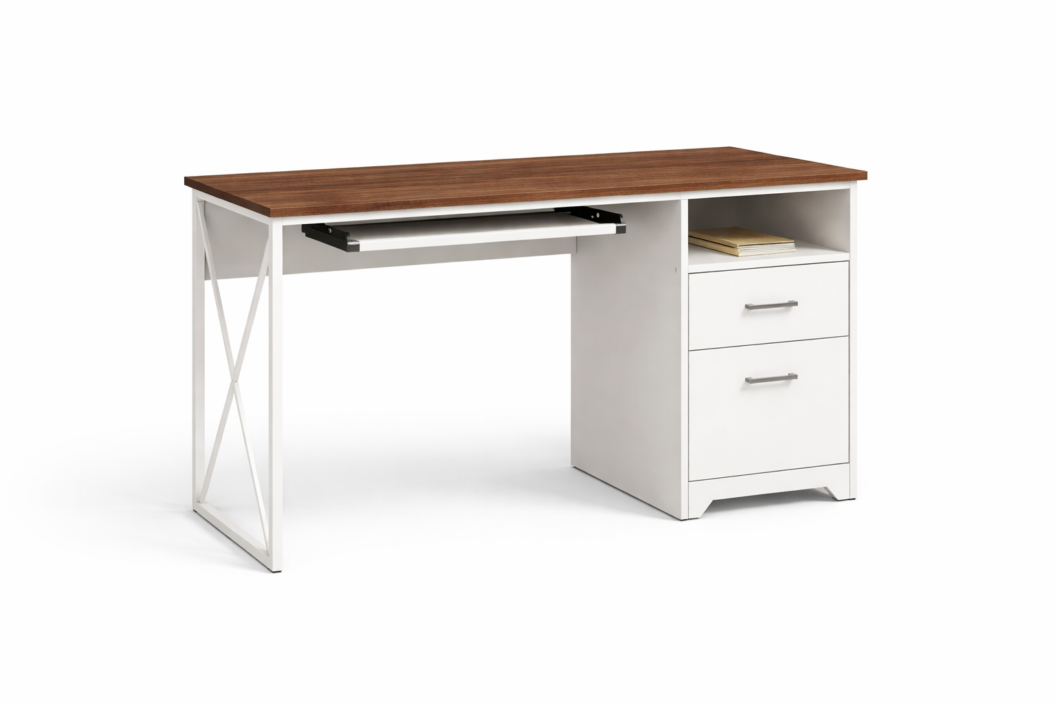 Escritorio prisma 120 cm color nogal con estructura blanca metálica. diseño moderno con cajonera lateral, repisa y bandeja deslizante. ideal para home office u oficina.