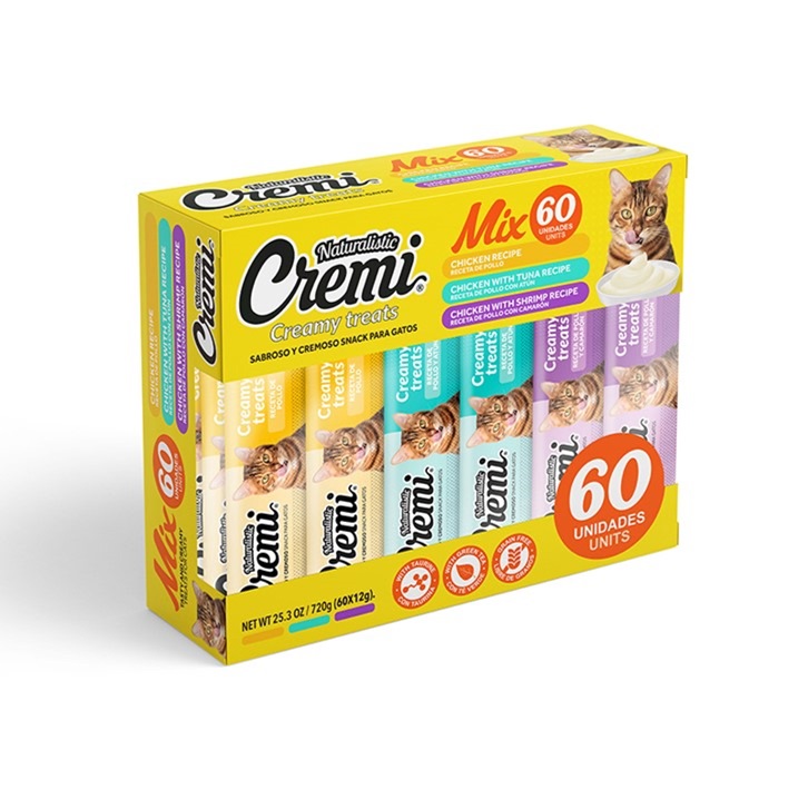 Increíble pack de 60 tubos de cremi en un mix de sus variedades de pollo, pollo/atún y pollo/camarón . elaborado con carne de pollo, atún y camarón, y reforzado con taurina aminoácido esencial para los gatos. la fórmula además contiene extracto de té verde que tiene un alto poder antioxidante. el alto porcentaje de humedad promueve la hidratación junto con un aporte calórico controlado de sólo 6.9 kcal por tubo de cremi. excelente opción para utilizarlo con juguetes interactivos, congelarlo en épocas de calor o reducir el estrés al momento de dar un medicamento. cremi es la mejor opción para fortalecer el vínculo con tu gato.