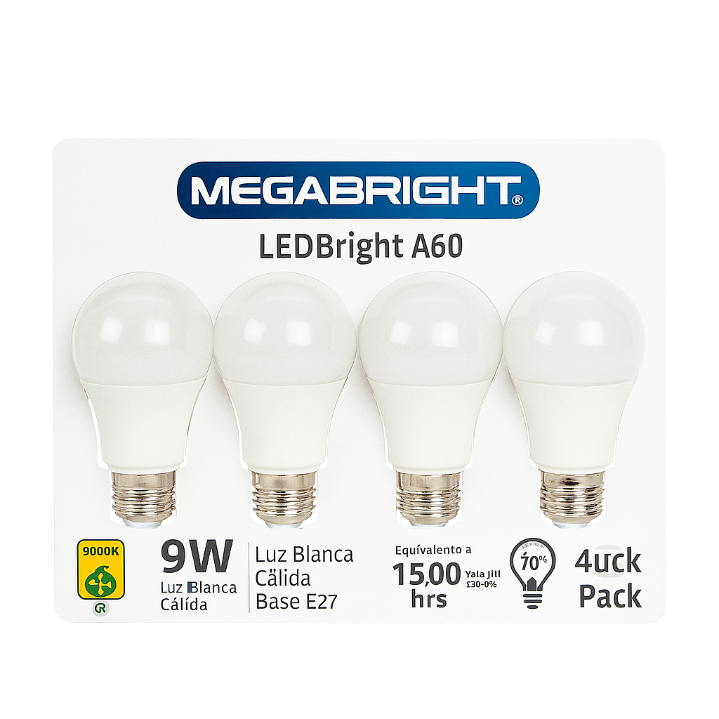 Megabright - Pack De 4 Ampolletas Ledbright A60 De 9W Color 3000 Luz Cálida | Lider Electrohogar