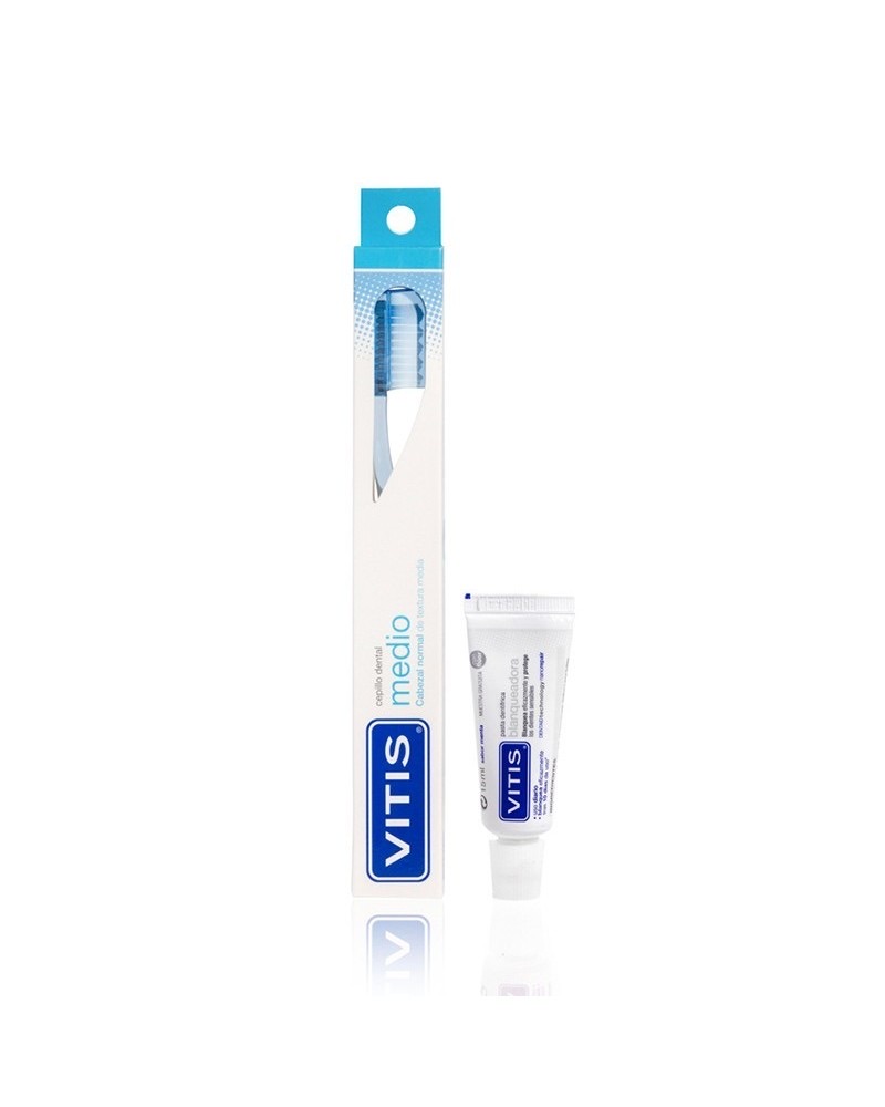Vitis medio cepillo dental+gel dentrítico 15 ml el cepillo vitis® medio es ideal para el uso diario. su cabezal de forma diamantada permite llegar a las zonas de difícil acceso de la cavidad bucal. los filamentos de textura media y con perfil ondulado, acceden a los espacios interdentales, facilitando la limpieza en el contorno de las encías.