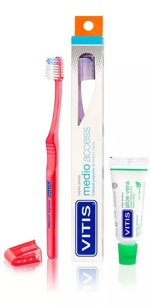 El cepillo dental vitis® medio access cuenta con un cabezal de tamaño reducido que facilita el acceso a las zonas posteriores de la boca y ayuda a minimizar los reflejos nauseosos. sus filamentos de dureza media y con perfil ondulado permiten una limpieza eficaz de los espacios interdentales y el contorno de las encías.
