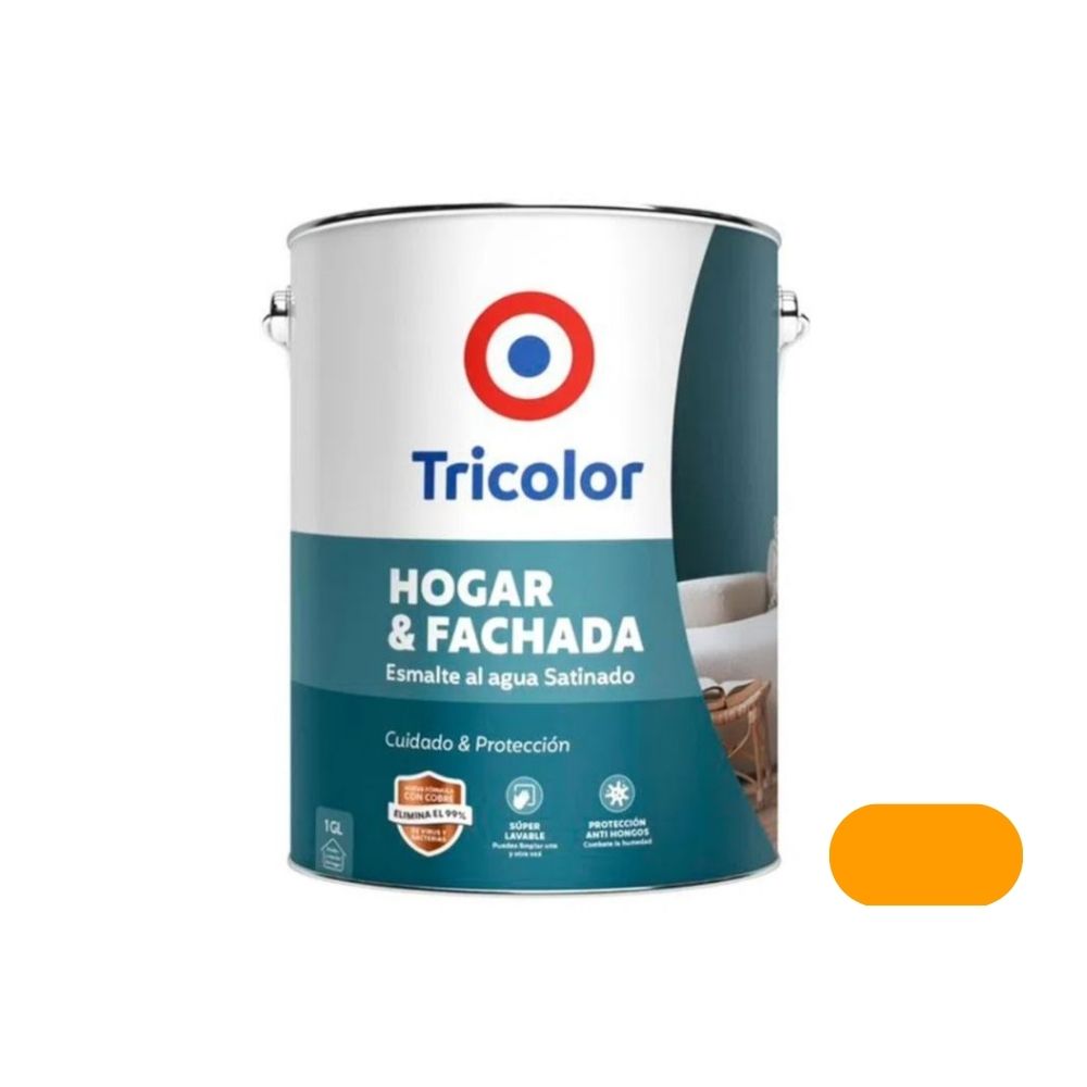 Esmalte al agua satinado hogar y fachada 1gln ocre - tricolor. hogar y fachada tricolor es una pintura base agua de acabado satinado con poder súper lavable, que permite limpiar una y otra vez el polvo o suciedad que puedan tener las paredes sin dañar la pintura. podrás disfrutar del ambiente más rápido ya que es una pintura de bajo olor y rápido secado. ofrece una protección antimicrobiana inteligente 24/7, su fórmula potenciada cuenta con una tecnología que contiene nano partículas de cobre eliminando el 99%* de virus, hongos y bacterias en solo 30 segundos. además, previene el crecimiento y la proliferación de los microorganismos creando un espacio cuidado y protegido. cuenta con certificaciones internacionales iso 22196–measurement of antibacterial activity on plastics and other non-porous surfaces, astm e105 y la normativa astm e1053 que estudia virus como el human coronavirus 229e atcc vr-740. usos recomendados: adecuado para ser usado en interior y exterior como living, dormitorio, comedor, baño, cocina, patio y fachadas, pintado sobre superficies tales como: estucos, concretos, ladrillos, empastes, yeso-cartón, fibrocemento y madera previamente acondicionado. número de manos recomendadas: 2 manos (dependiendo del tipo de superficie y del color de fondo a cubrir). rendimiento teórico máximo: 45 m2/gal por mano. terminación: satinada. *testeado en human coronavirus cepa 229e, eschericia coli atcc25922, staphylococcus aureus atcc6538, aspergillus niger atcc16888.