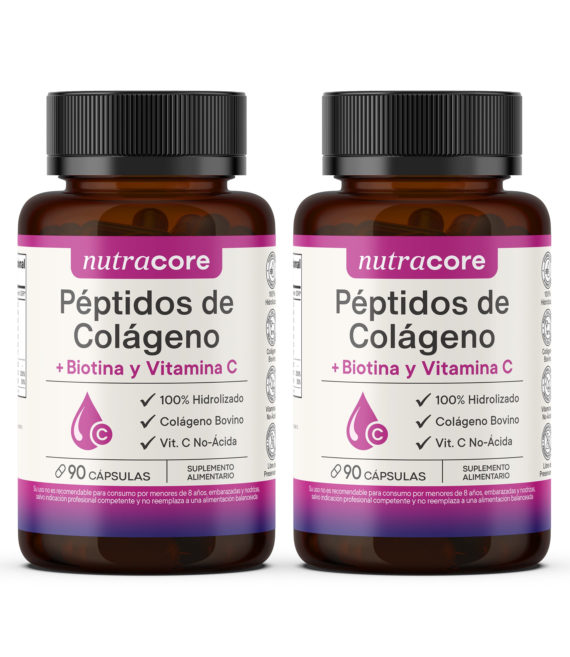 Péptidos de colágeno hidrolizado + biotina y vitamina c no-ácida - pack de 2x90 cápsulas | nutracore