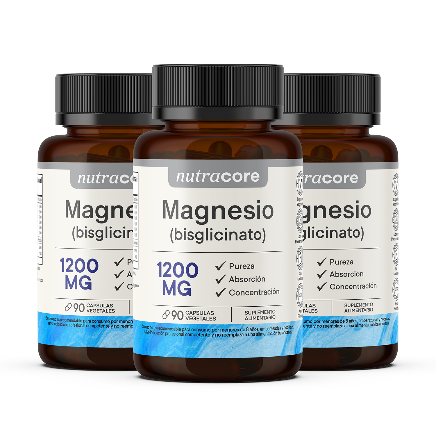 Bisglicinato de magnesio en pack de 4.5 meses. 3x90 cápsulas vegetales 1200mg de nutracore - 270 cápsulas en total. 100% natural.