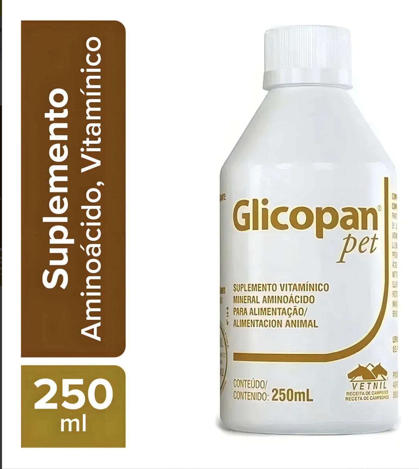 Glicopan pet suplemento perros y gatos 250 ml glicopanpet proporciona una respuesta rápida para animales en condición nutricional inadecuada, porque combina aminoácidos, vitaminas del complejo b y glucosa. indicación en la suplementación de aminoácidos y vitaminas del complejo b para caninos, felinos, aves, mustélidos, reptiles y roedores. auxilia en la mejora del estado general y en casos de animales con estado nutricional inadecuado. auxilia en el estímulo del apetito y es energético. indicado en el preparo de animales para exposición y animales en entrenamiento modo de uso para utilizarse por vía oral puro, añadido al alimento o en el agua de bebida. caninos, felinos, mustélidos y reptiles: 0,5 ml por kg de peso corporal o 7 gotas por kg de peso corporal, dos veces al día (dosis máxima diaria: 40 ml). aves y roedores: 1 ml, o 15 gotas, diluido en 100 ml de agua de bebida (10 ml por litro de agua de bebida), o aún 3 a 4 gotas, una vez al día, directamente en la boca.