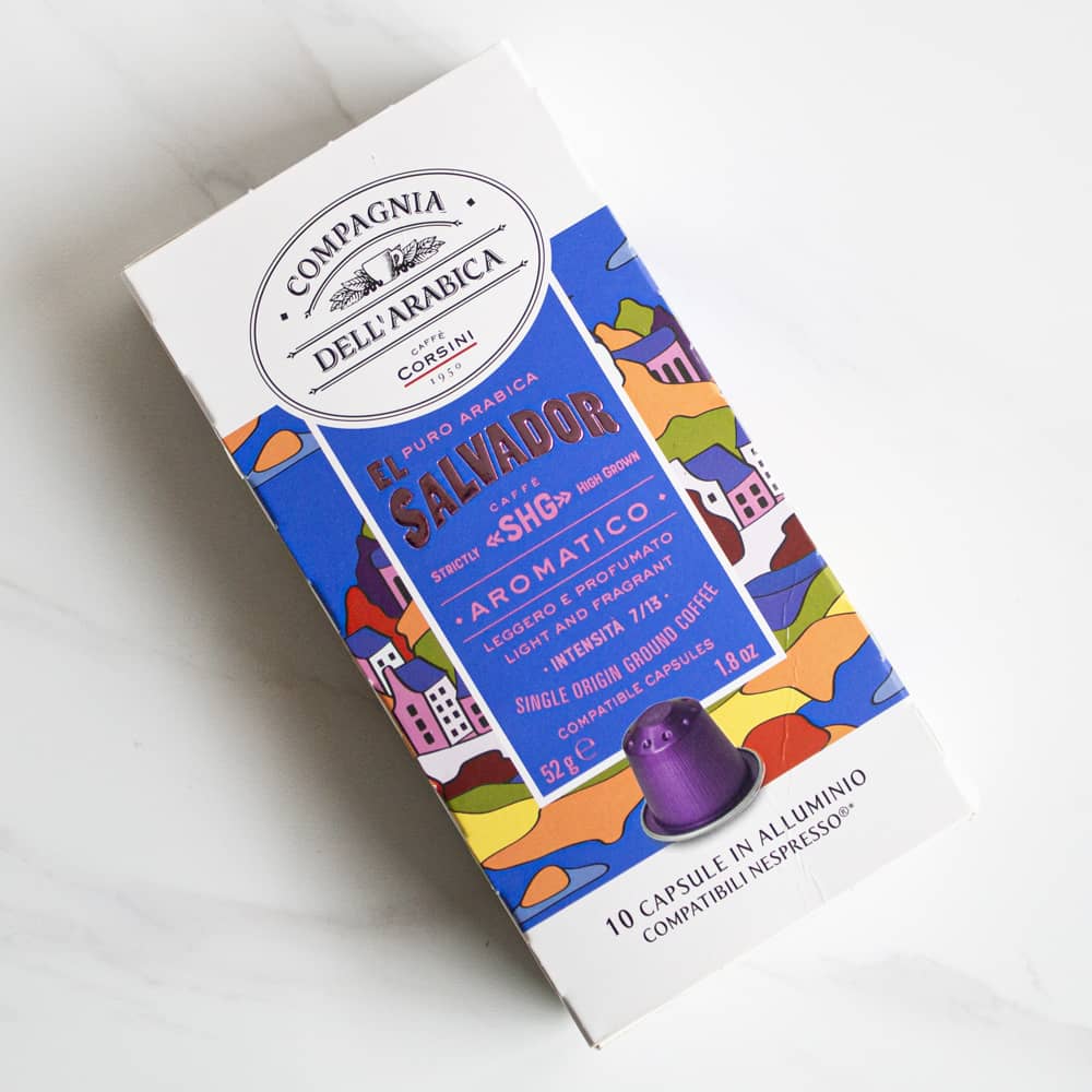 10 capsulas de café corsini el salvador cápsulas de aluminio cada una contiene 5,2 gramos de café tostado y molido. el salvador, café 100% arábico, ligero, aromático y con baja acidez. origen único, cuidadosamente seleccionado y tostado con maestría para ofrecer la mejor calidad. el tueste medio aporta notas de miel y chocolate en cada taza. el sabor y el aroma se conservan a la perfección gracias al al envasado en atmósfera protectora inerte. shg (strictly high grown) significa que se cultiva a una altitud superior a los 1200 metros: a mayor altitud, mejor calidad. - tostado: medio - cuerpo: 2/6 - dulzura: 5/6 - tamaño: compatible con cápsulas nespresso® - composición mezcla/ ingredientes: 100% café arábico, el salvador