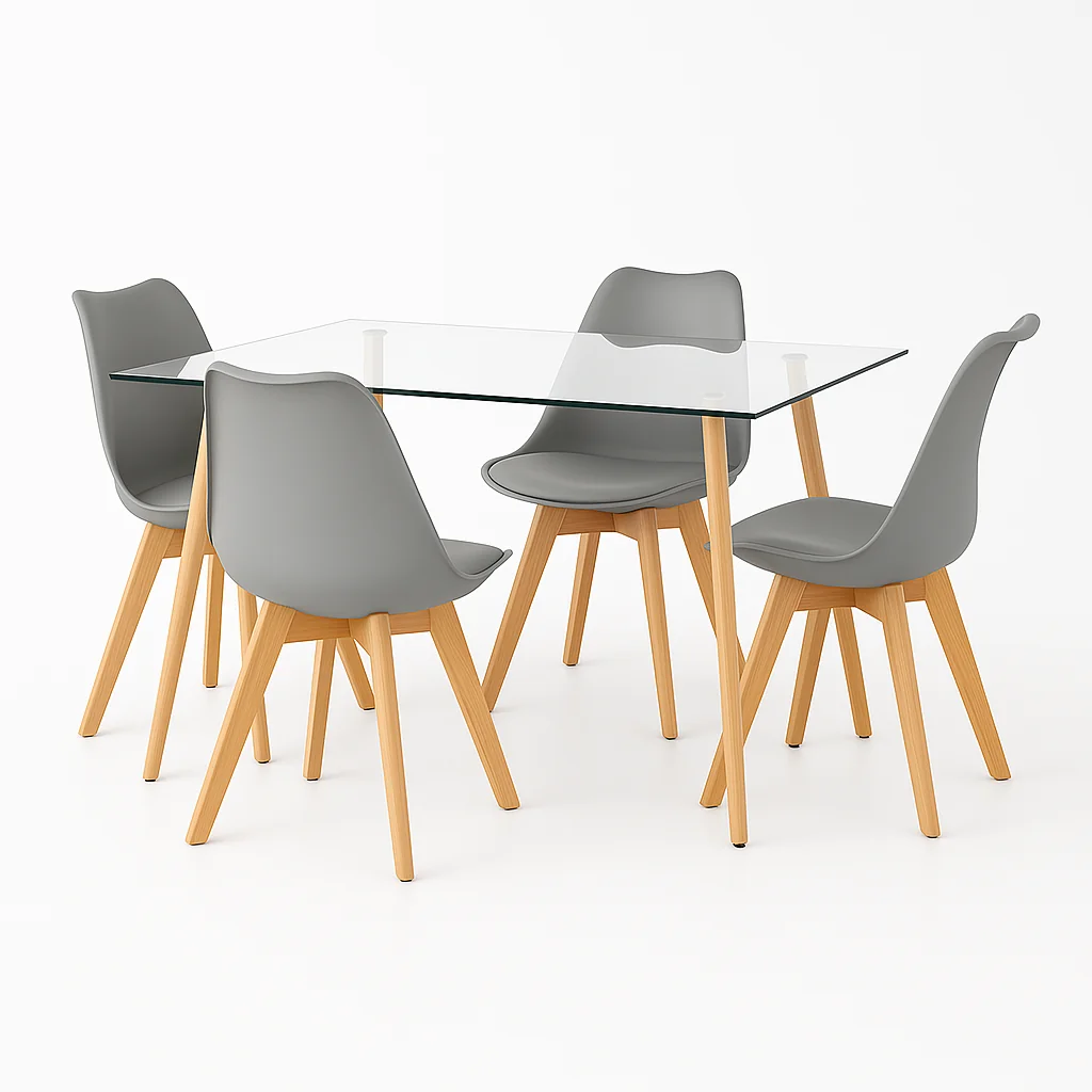 Comedor Mesa de Vidrio Nórdica 140x90 cm + 4 Sillas Tulip Grises