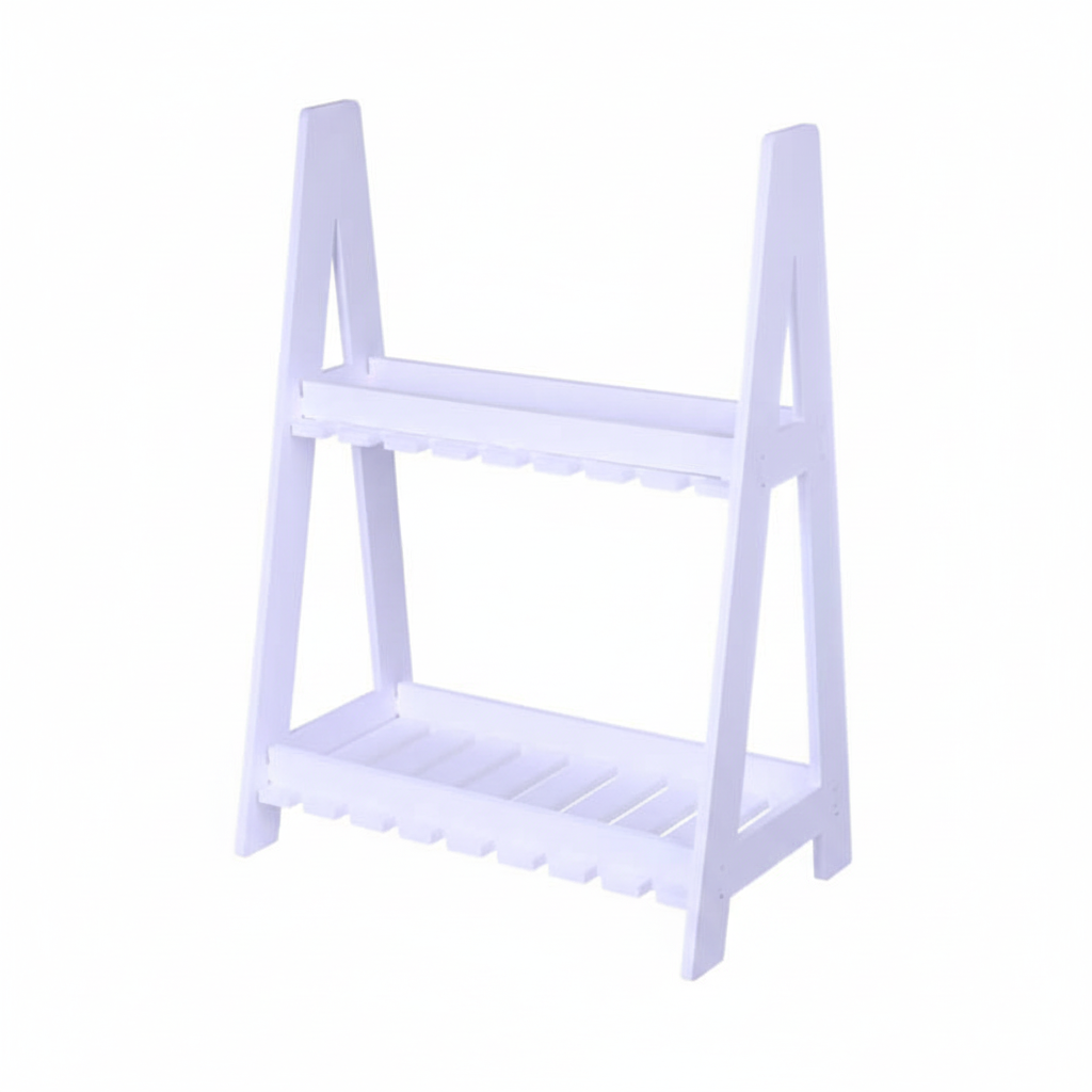Estante escalera blanco de 2 niveles con diseño minimalista. medidas: 53cm alto × 39.5cm ancho × 21.5cm profundidad. ideal para baños, dormitorios o living. perfecto para plantas, libros, productos de baño y decoración. optimiza espacios pequeños con estilo.