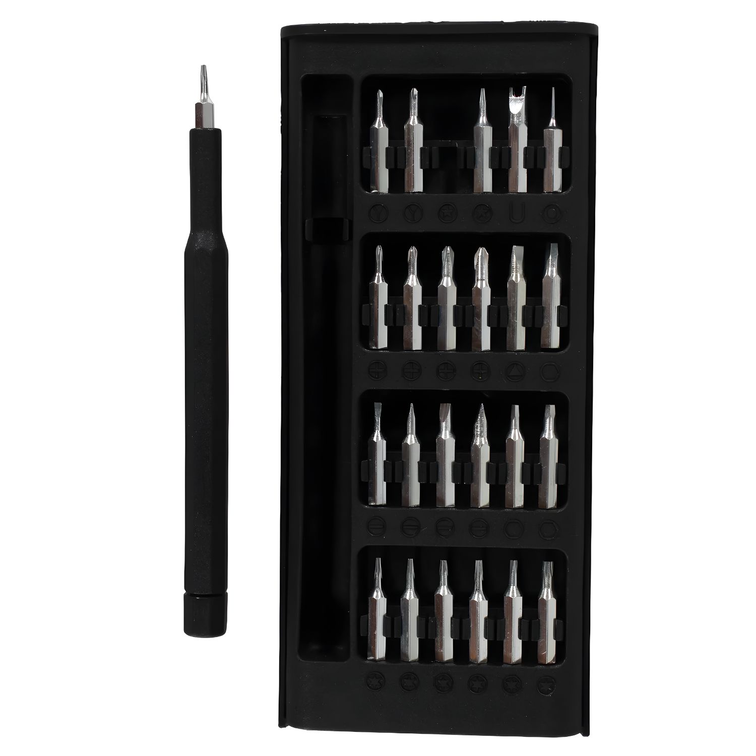 El set de destornillador de alta precisión 24 piezas pro quality es ideal para trabajos finos y delicados como reparación de electrónica, celulares, notebooks, relojes y dispositivos pequeños. un kit completo, resistente y fácil de transportar. sus puntas intercambiables de acero endurecido ofrecen alta durabilidad y resistencia al desgaste, mientras que el mango ergonómico antideslizante brinda control total y comodidad en cada uso.