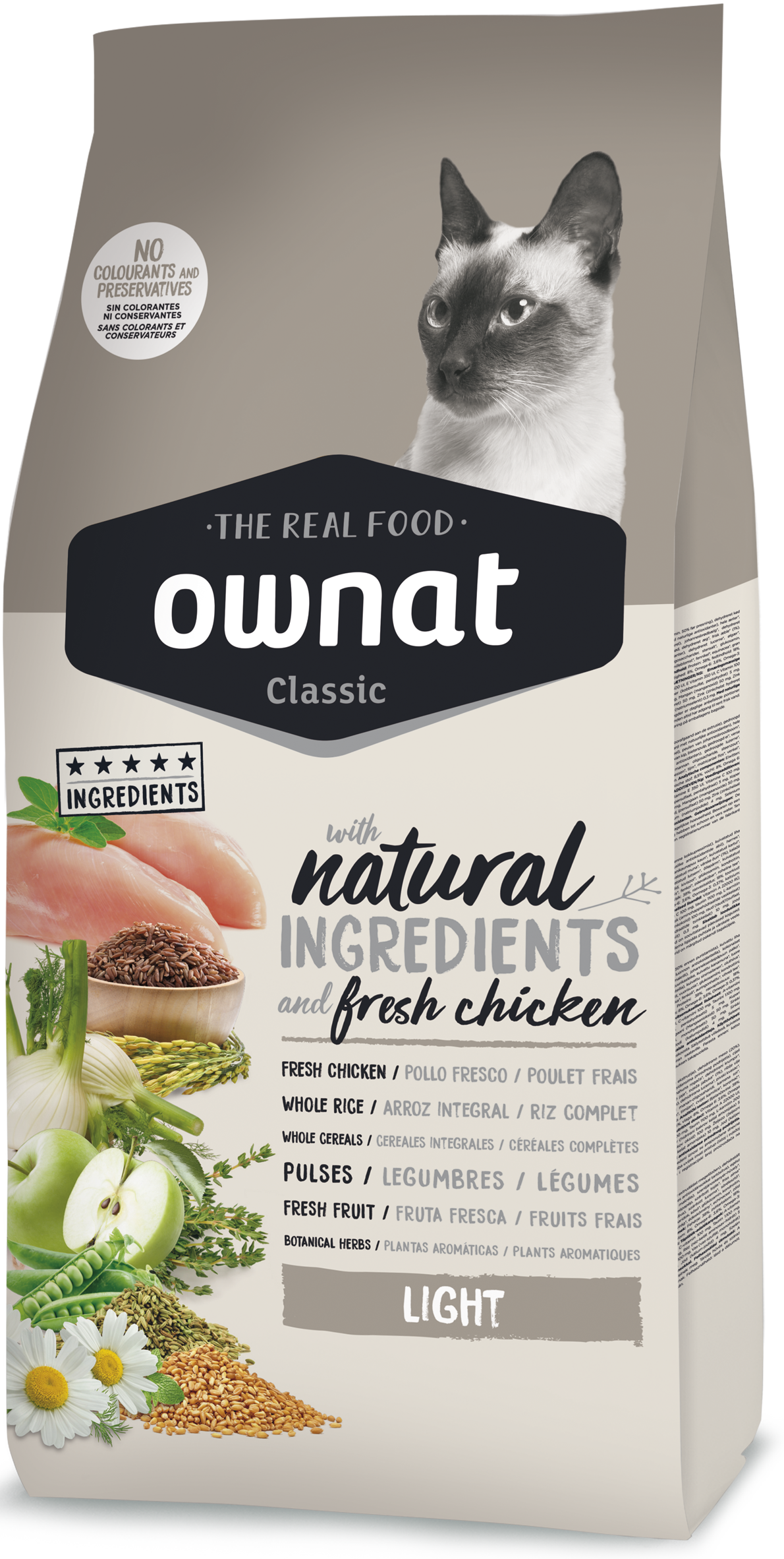 Ownat classic light cat es un alimento seco especialmente formulado para gatos adultos con sobrepeso. su bajo contenido en grasas (9%) y alto nivel de proteínas (27%) ayudan a reducir las calorías sin comprometer la masa muscular de tu felino. elaborado con ingredientes naturales como pollo fresco (10%), cereales integrales, guisantes y manzana, esta fórmula no contiene conservantes ni colorantes artificiales, promoviendo una digestión saludable y un pelaje brillante. además, incluye hierbas aromáticas y yucca schidigera para mejorar la digestión y reducir el olor de las heces