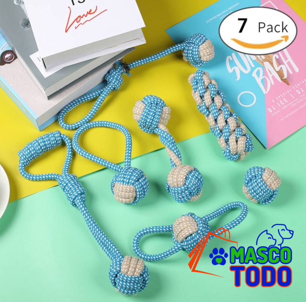 Set 7 juguetes mascotas perro bola, cuerdas nudos en algodón