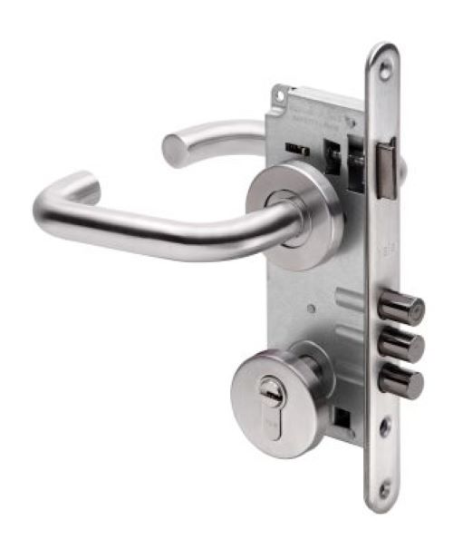 • cerradura embutida • cerrojo de 3 pitones • manillas libres ambos lados • cilindro europerfil 70mm multipunto con rosetas • manillas y rosetas de acero inoxidable calidad aisi304 • llave ambos lados • incluye 5 llaves planas multipunto • doble vuelta de llave • ajustable a puertas de 35mm a 50mm de espesor • picaporte reversible • backset 60 mm • terminación: inoxidable uso: oficina