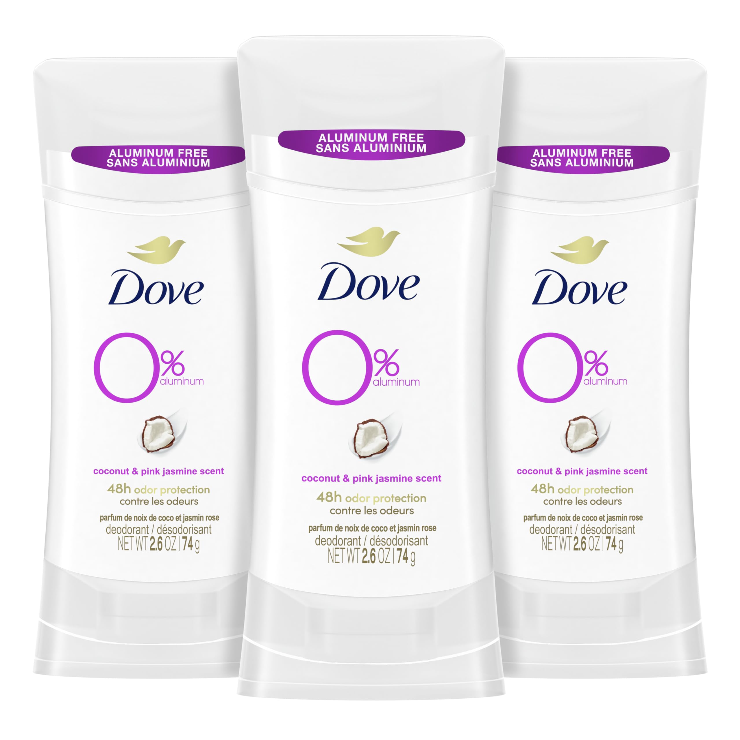 Desodorante dove sin aluminio para mujer que protege los olores las 24 horas, coco y jazmín rosa, 7.8 oz, 3 unidades. el desodorante dove sin aluminio en coco y jazmín rosa, 2.6 oz, paquete de 3 desodorantes a granel proporciona hasta 24 horas de protección contra el olor. este es el mejor desodorante de dove para mujeres que buscan una solución desodorante sin aluminio que contenga un 0% de alcohol (etanol), fórmula desodorante a la piel. contiene ¼ de humectantes para brindar un excelente cuidado de las axilas. también puedes confiar en que dove está certificada como libre de crueldad animal por peta. con un delicado aroma a coco y flores, este desodorante para mujer también ayuda a la piel a recuperarse y a reducir la irritación después del afeitado, para que puedas disfrutar de unas axilas más suaves y tersas. el desodorante dove sin aluminio para mujer te protege hasta 24 horas del sudor de las axilas y del mal olor corporal. este desodorante te permitirá empezar la mañana de cero o refrescarte cuando lo necesites