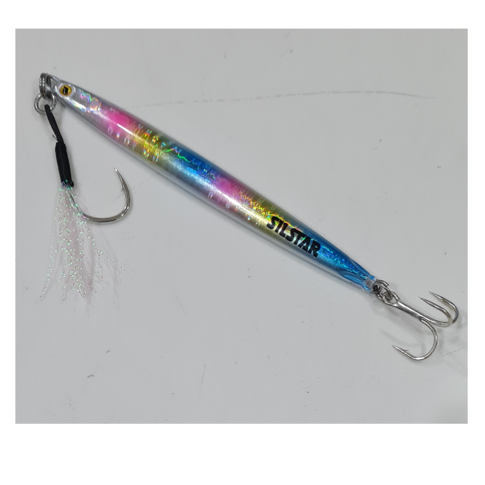 Señ silst 10c 30g prof payaso señuelo jig o chispa marca silstar modelo pen bait con dos anzuelos y fibras color lomo, inferior y centro payaso azul/amarillo/fucsia/plata fibra stream verde brillo ojo negro sobre amarillo solo en un lado anzuelo simple nro 15 con fibra stream adelante anzuelo triple nro 6 atras peso 30 gramos tamaño 10+1+0,5 cms material plomo recubierto en fibra lados disimiles para generar movimientos eraticos lados disimiles tambien generan difernte refratacion de la luz para atraer a la presa ojetillos en ambos extremos ideal para lance contra el viento y larga distancia venta por unidad