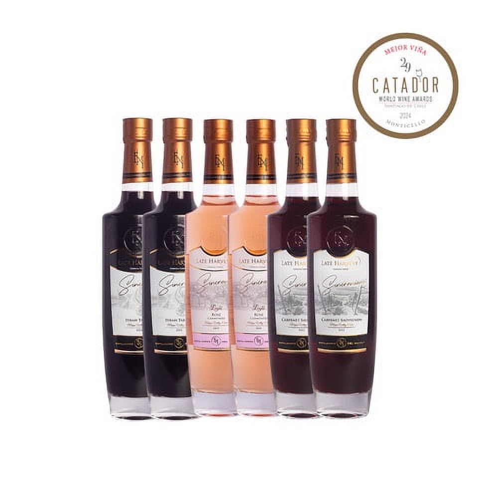 Esta caja incluye 6 late harvest sincronía, de viña espaldares del maipo, cada botella contiene 405 ml y viene con tapon abre facil, las cepas son todas tintas y se dividen en: 2 late harvest cabernet suvignon 12,5 º , 2 late harvest rose ligth bajos en graduacion en alchoolica 11,º y en azucar son de carmenere, 2 late harvest syrah tardio 12,5 º, se recomiendan servir frios y acompañar con quesos maduros y frutos secos, en el caso de acompañar con un postre se recomienda que este no sea tan dulce si no mas bien acido como un pie de maracuya.