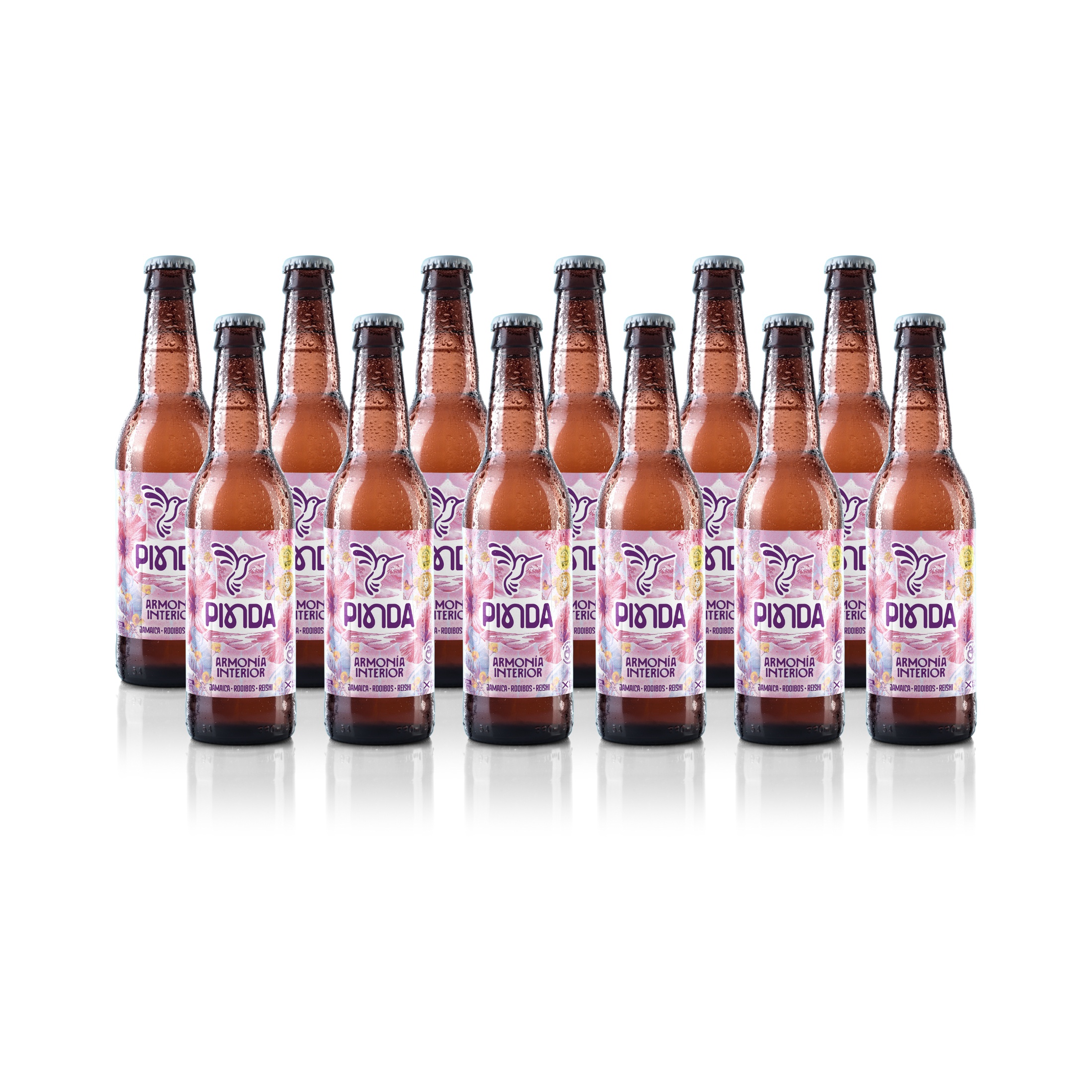 Pack de 12 kombuchas armonía interior pinda kombucha, sin cafeína con rooibos, jamaica y reishi, artesanal. 12 x 330 ml.