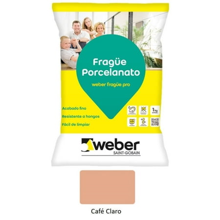 Fragüe porcelanato 1kg café claro - weber. fragüe en polvo, que al mezclar con agua forma una pasta elástica para el relleno de canterías de porcelanatos. al secar, se transforma en un relleno de alta resistencia, ideal para canterías delgadas de porcelanatos. su terminación lisa la hace más fácil de limpiar. mayor flexibilidad. resistente a hongos. terminación fina. no se fisura. fácil de limpiar. resistente a la compresión.