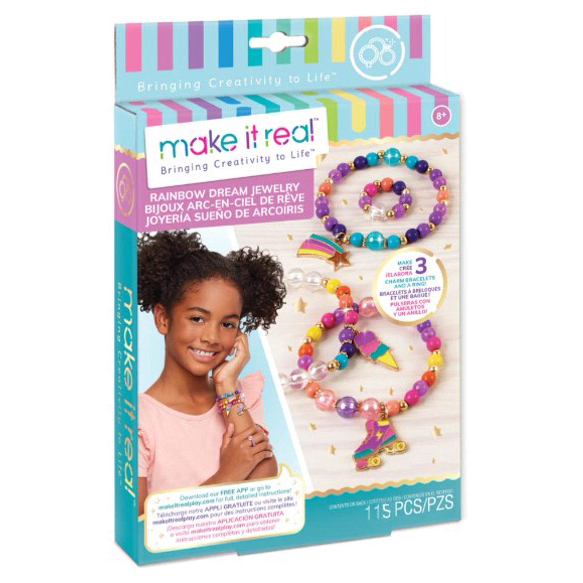A los futuros diseñadores de joyas les encantará personalizar tres brazaletes de arcoíris y un anillo a juego con este juego todo incluido. todo lo que falta es su ojo creativo único. incluye: 70 cuentas de plástico, 30 cuentas de oro, 12 cuentas espaciadoras de oro, 3 encantos únicos, 1 cordón elástico transparente de 1 m (1,1 yd), 1 hoja de instrucciones, 1 bandeja de juego. se recomienda de 8 años en adelante.