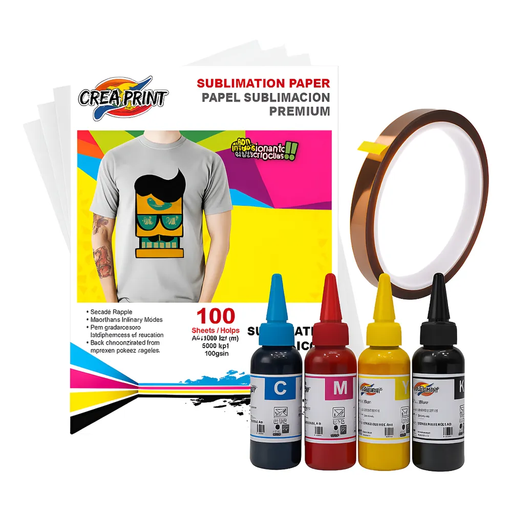 100 Hojas de sublimación tamaño A4, Densidad 110 grs, Colores mas nítidos y mayor duración. Pack de tintas creaprint, 4 colores (100cc c/u) para sublimacion total 400 ml Tape resistente a altas temperaturas. Compatibles con impresoras Epson y Brother Garantía del vendedor: 90 días