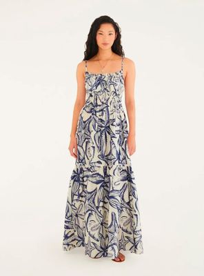 Vestido Midi Fruncido Delantero Diseño de Palmera Bordado