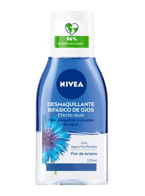 "obtén una limpieza e hidratación profunda que cuida tu piel con nuestro desmaquillante bifásico para ojos de nivea. retira el maquillaje sin complicaciones con nuestro desmaquillante facial bifásico que elimina el maquillaje a prueba de agua sin dejar una sensación grasosa en la piel. nuestro desmaquillante facial, con su fórmula enriquecida con flor de aciano y biotina, elimina el maquillaje a prueba de agua al mismo tiempo que limpia y refresca tu piel.