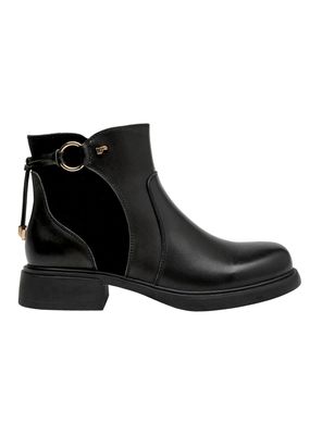Elegante botín de cuero negro para mujer, ideal para un look urbano chic, con taco medio y hebilla decorativa.