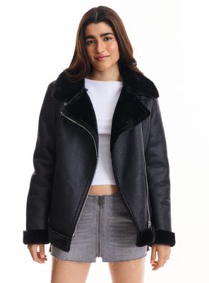 Chaqueta Aviadora Look Cuero y Sherpa
