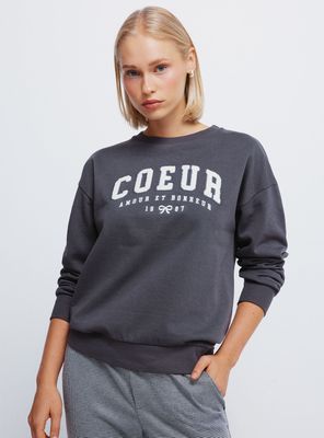 Sudadera recta de manga larga caída, con cuello redondo, con estampado gráfico posicional de texto con relieve en el delantero, con canalé en el cuello en los puños y en el bajo.