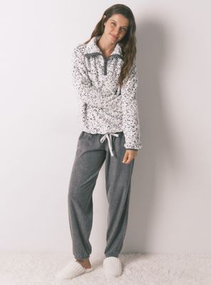 Pijama de manga larga confeccionado en polar de pelo efecto jacquard de print animal y pantalón de polar suave. ideal para estar en casa calentita y con estilo. parte de arriba de cuello elevado con cremallera. manga caída con cinturilla regulable mediante cordón a tono. cremallera y puños viveados con elástico a tono. pantalón de corte holgado con cintiurilla y puños elásticos. el tejido principal contiene al menos un 50% de fibras de poliéster reciclado.