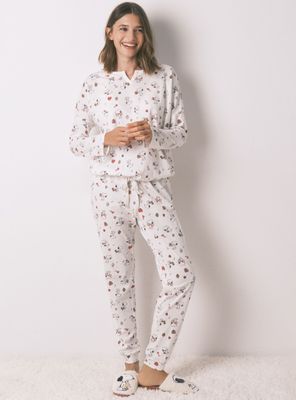 Pijama de camiseta manga larga y pantalón largo, confeccionado en tejido 100% algodón, con estampado allover de snoopy ¡perfecto para esas noches más fresquitas y para estar en casa súper calentita y con estilo! . top de escote redondo, con pequeña tapeta de botones, mangas caídas y cinturilla regulable mediante cordón a tono con el estampado. pantalón tipo skinny con puños a tono y cinturilla elástica de jacquard con "peanuts" bordado.
