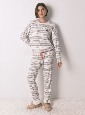 Pijama de manga larga y pantalón largo confeccionado en tejido de punto cálido super soft con estampado allover de cenefas multicolor. súper calentito y agradable al tacto, ideal para estar en casa sin pasar ni pizca de frio.