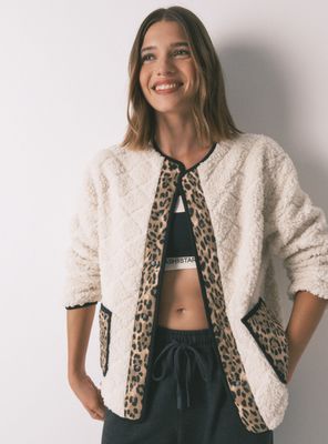 Chaqueta corta reversible con estampado de leopardo por un lado y lisa por el otro con detalles en el animal print. está confeccionada con doble tejido: uno en calidad acolchado súper suave y otro en tejido de borreguito con relieve. es súper calentita y agradable al tacto. llévala a juego con un pijama de la colección, y mantén tu estilo también en casa o en tus looks de calle.