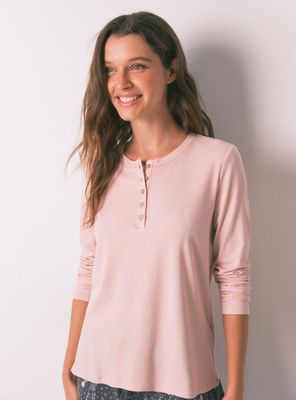 Camiseta lisa de manga larga caída, en tejido canalé de viscosa con detalle de brillos. top de escote redondo y tapeta con abotonadura de botones brillantes. ¡perfecta para esas noches más fresquitas y para estar en casa súper calentita y con estilo!