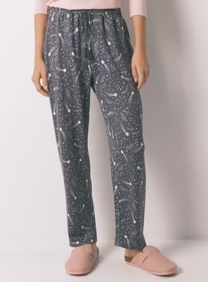 Pantalón largo carrot, en tejido de punto cálido super soft, con estampado de estrellas a contraste. lleva bolsillos en los laterales y cinturilla smock regulable mediante cordón a tono con borlas y detalles de estrellas decorativa en los extremos ¡perfecto para esas noches más fresquitas y para estar en casa súper calentita y con estilo!