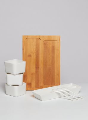 Cuenco cuadrado: 8.6 x 8.6 x 5.6 cm | plato doble de oliva: 25.5 x 8.5 x 3.8 cm | cuchara: 12.5 x 2.5 x 1 cm | bambú: 28.7 x 20.3 x 1.3 cm