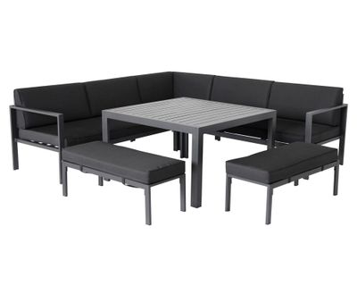 1 mesa, 2 sofás doble, 1 sofá esquinero, 1 banco
