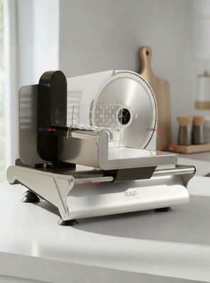 CARACTER ÍSTICAS Y BENEFICIOS:- Bajo nivel de ruido:Permite un funcionamiento silencioso, lo cual es beneficioso para usar la maquina en cualquier momento del dia sin causar molestias en el hogar.- Cuchilla de acero inoxidable (di ametro de 190 mm):Su cuchilla afilada y resistente esta fabricada en acero inoxidable, lo que asegura cortes limpios y precisos, asi como una mayor durabilidad frente al desgaste. Esto significa menos necesidad de reemplazo y un mejor rendimiento en el tiempo.- Carcasa Resistente de Aluminio:Proporciona una mayor resistencia y estabilidad al aparato, sino que tambien es facil de limpiar y mantener, garantizando una larga vida util del producto.- Vag on con proteccion para los dedos:La seguridad es una prioridad. Este diseño incluye una proteccion que evita el contacto accidental con la cuchilla, reduciendo el riesgo de lesiones durante el uso.- Ajuste del grosor de corte (0-15 mm):Esta caracteristica le permite personalizar el grosor de las rebanadas, adecuandolo a sus preferencias y necesidades en la cocina, ya sea para hacer deliciosas bandejas de embutidos o para preparar ingredientes para una receta especial.- Empujador de alimentos transparente con dispositivo de protecci on:El empujador facilita el manejo de los alimentos mientras proporciona una visibilidad clara de lo que se esta cortando, asegurando que pueda supervisar el proceso mientras mantiene sus manos alejadas de la cuchilla.- Pies antideslizantes:Garantizan estabilidad durante el uso, evitando movimientos indeseados que puedan causar accidentes y asegurando que su experiencia de corte sea segura y comoda.- Funcionalidad como cortador autom atico:Ademas de su capacidad de cortar carne y embutidos, este aparato sirve tambien para rebanar rollos de cordero y pan, aumentando su versatilidad en la cocina y ayudandole a preparar una variedad de platillos con facilidad.- Cuchillo desmontable:El diseño permite una facil limpieza y mantenimiento, asegurando que se pueda conservar en optimas condiciones, lo que contribuye a la durabilidad del producto.Especificaciones:********- Pa is de Origen:China- Modelo:Rebanadora Cortadora RAF R.8800- Potencia:220W- Di ametro de la cuchilla:190 mm- Material de la cuchilla:Acero inoxidable- Grosor de corte ajustable:0 - 15 mm- Material de la carcasa:Aluminio fundido a presion.- Sistema de seguridad:Vagon con proteccion para los dedos- Empujador: Transparente y con dispositivo de proteccion.- Voltaje:220-240 V- Funciones adicionales: Cortador automatico de carne, rollo de cordero, fiambre, pan y verduras.****- Cuchilla:Desmontable para una facil limpieza.- Color:****Plateado.