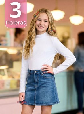 Pack 3 Poleras Camiseta Polar Blanca Primera Capa Cuello Beatle Mangas Largas Niñas | Paris