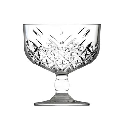 Esta copa para helado de 280ml de la linea Timeless de Pasabahce esta fabricada en vidrio templado de alta resistencia, con un diseño tallado tipo cristal que aporta elegancia a la presentacion de postres. Su estructura solida con tallo corto y borde reforzado la hace ideal para el uso diario en ambientes gastronomicos exigentes como heladerias, restaurantes y cafeterias.