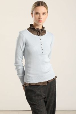 Jersey punto basico, celeste, escote redondo, pata corta con botones en centro delantero, manga larga con puño y pretina en ruedo. Cuidados: lavar a mano en agua fría con detergente neutro, no perclorar, no retorcer, no planchar, permite lavado en seco, no centrifugar, lavar por separado con colores similares