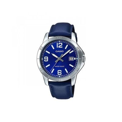 Somos distribuidores exclusivos en Chile. Reloj marca Casio modelo MTP-V004L-2BUDF Hombre de color Plateado con correa de Cuero de color Azul perteneciente a la colección Classic con una caja de Acero inoxidable tablero Azul con un cristal Mineral y una banda de 22x220 resistencia al agua de 30 Mts un tamaño de caja de 47mm con movimiento Quartz fabricado en Japón.