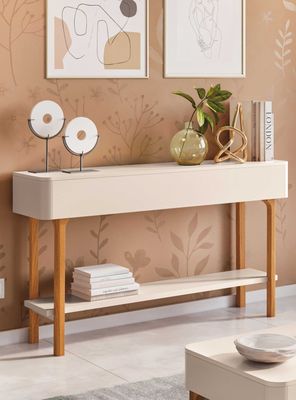 El Arrimo Nantes Off White es un mueble decorativo y funcional que aporta elegancia y luminosidad a tu living, recibidor o comedor. Su diseño moderno de líneas suaves, con estructura en off white y patas en tono madera, crea un estilo cálido y sofisticado que se adapta fácilmente a distintos ambientes. Fabricado en MDF de alta calidad, ofrece una superficie firme y un estante inferior ideal para organizar y exhibir objetos decorativos. Perfecto para complementar tu hogar con un mueble práctico y de gran presencia.