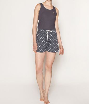 Conoce nuestra nueva línea de pijamas Monarch, diseñada para ofrecerte comodidad y estilo en tus momentos de descanso. Este pijama de 2 piezas para mujer incluye una polera musculosa ligera y fresca, combinada con un rib short estampado que aporta un sutil toque de diseño. Confeccionado en algodón suave y transpirable, brinda una sensación de confort natural y libertad de movimiento, ideal para descansar o relajarte en casa. Composición: Polera 95% Algodón ; 5% Elastano - Short: 100% Algodón