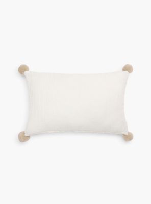 Este coj in relleno de muselina combina un exterior de 100% algodon con relleno de poliester para ofrecer una textura ligera y acogedora. Decorado con pompones en las esquinas , aporta un detalle divertido y delicado a cualquier espacio. Ideal para camas, sillones o rincones de descanso con estilo relajado.